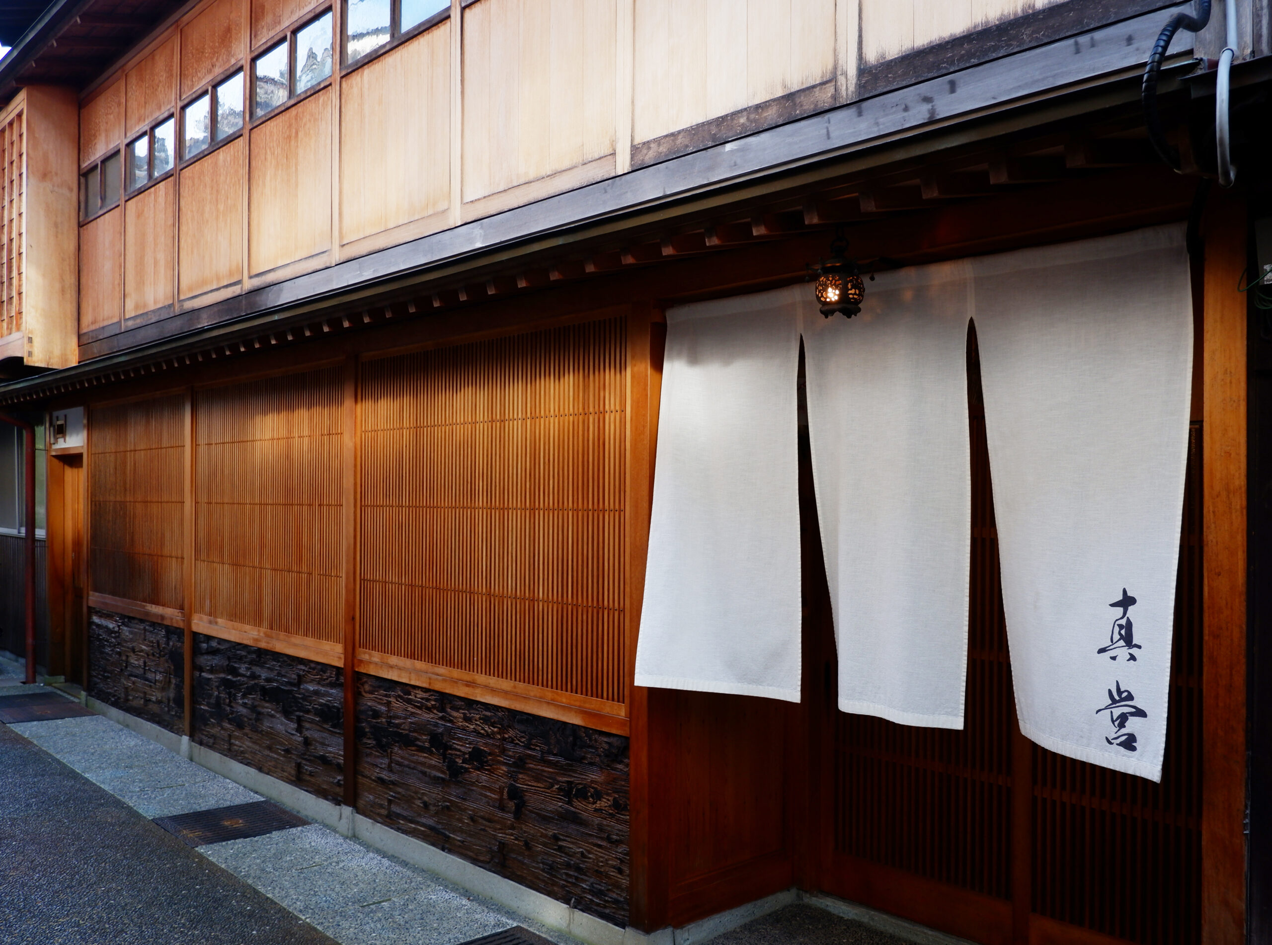 ひがし茶屋街の粋な大人の社交場としてにぎわった当時の面影を残す風雅な路地に真っ白な暖簾が揺れるなんとも趣深いお店は